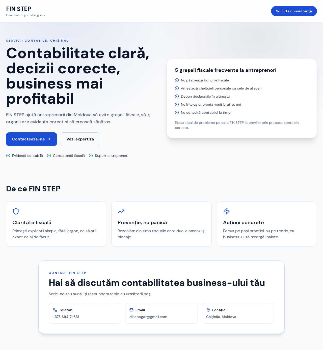Professional website for FIN STEP, an accounting and tax consultancy firm in Chișinău, Moldova. Conversion-focused layout with lead capture forms.